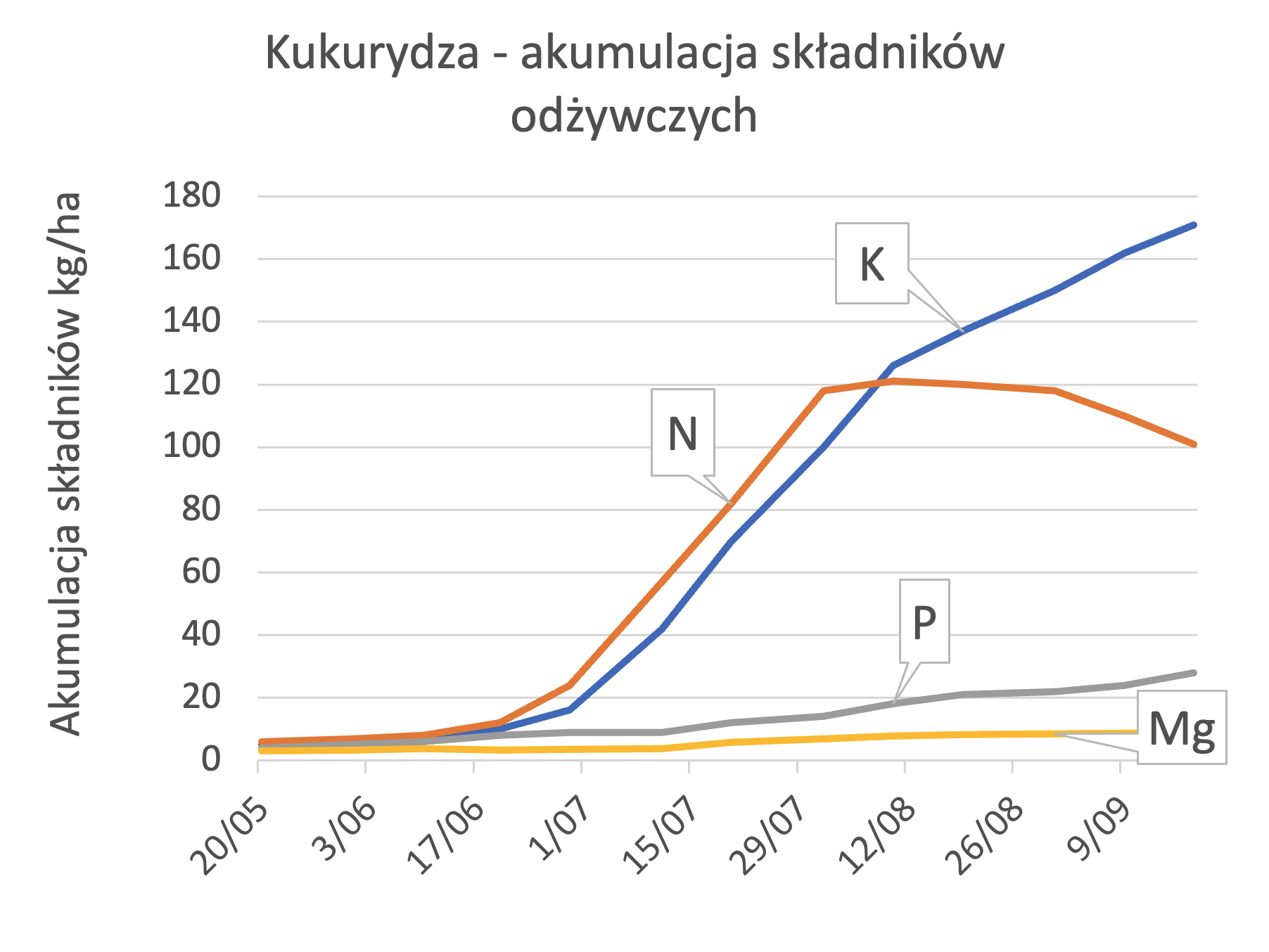 Potas w kukurydzy jest akumulowany głównie w łodydze i liściach, zatem najbardziej dynamiczne pobranie ma miejsce podczas wydłużania pędu – pomiędzy 8 a 14 liściem. I wtedy też roślina jest najbardziej narażona na niedobory. Można pomyśleć, że to przed ukształtowaniem się kolby, więc problem jest niewielki, jednak w tym czasie uprawa akumuluje ponad 60% całego potasu. Składniki zakumulowane w liściach i łodydze posłużą później do budowania kolb i ich wypełnienia ziarnem. Jeśli ich będzie za mało, to kolby się nie wypełnią.