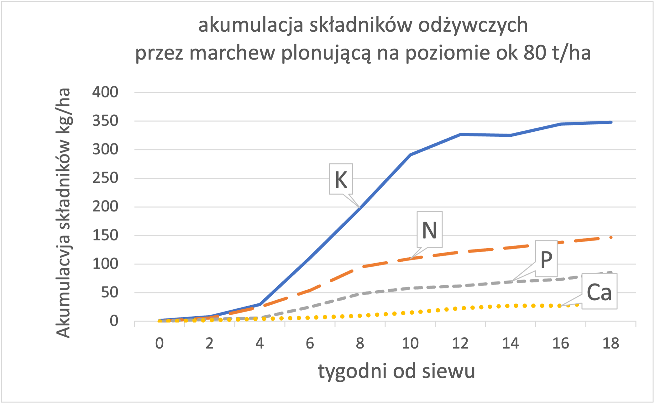 Proszę zwrócić uwagę na pokazany obok wykres akumulacji składników przez marchew do późnego zbioru. Marchew nie tylko pobiera 2 x więcej potasu niż azotu, ale przede wszystkim zaczyna pobierać potas bardzo intensywnie już od początku wzrostu korzenia na grubość. Niewystarczająca dostępność potasu z gleby w tym czasie, powoduje straty plonu a czasem też i parametrów jakościowych, których roślina nie może uzupełnić później. O przyczynach ograniczonej dostępności potasu w tym czasie więcej w zakładce WIEDZA. Początek wzrostu korzenia na grubość to jest najlepszy czas na pierwszy zabieg K-VITAL w warzywach korzeniowych i cebulach. Najlepiej przeprowadzić go w mieszaninie z zabiegiem fungicydowym lub insektycydowym.